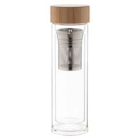 Dvoustěnná, izolovaná láhev z borosilikátového skla s čajovým spařovačem a bambusovým víčkem. 420 ml.