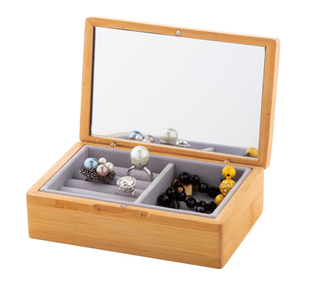 Bambusová šperkovnice s vnitřní sametovou výplní a zrcátkem ve víku.