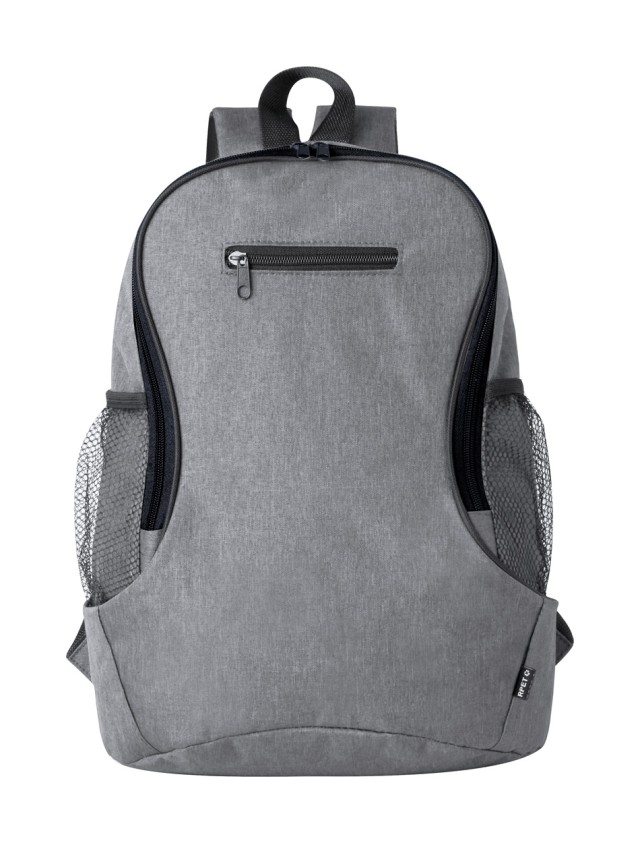 Batoh RPET s přihrádkou na zip a přední kapsou, boční síťované kapsy, polstrovaná záda a ramenní popruhy. 300D RPET polyester s výrazným štítkem RPET.