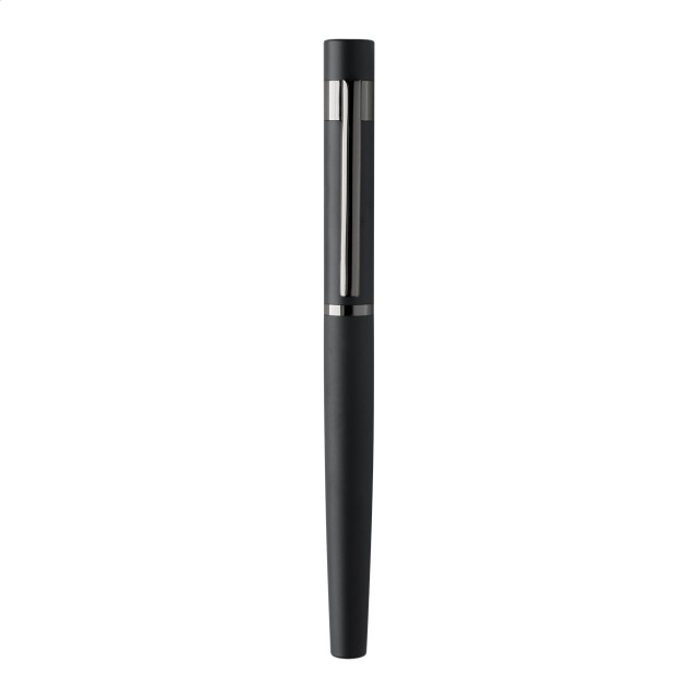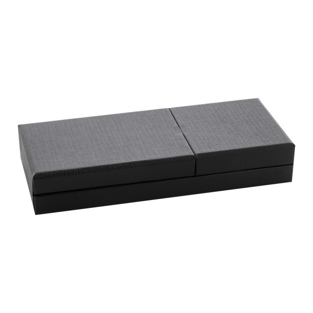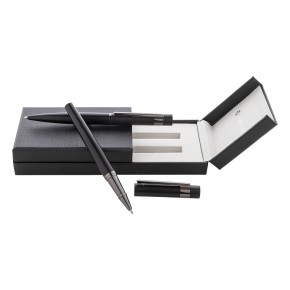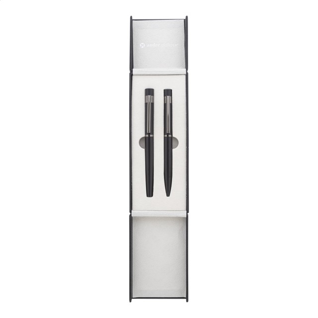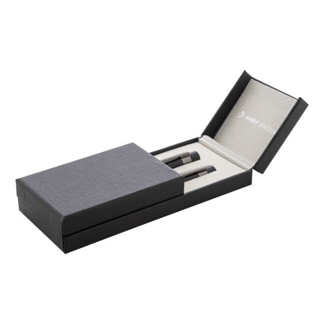 Elegantní sada kovového kuličkového pera a rolleru s lesklými detaily v barvě antracit. V barevně sladěné dárkové krabičce a s modrou náplní. Produkt značky André Philippe.
