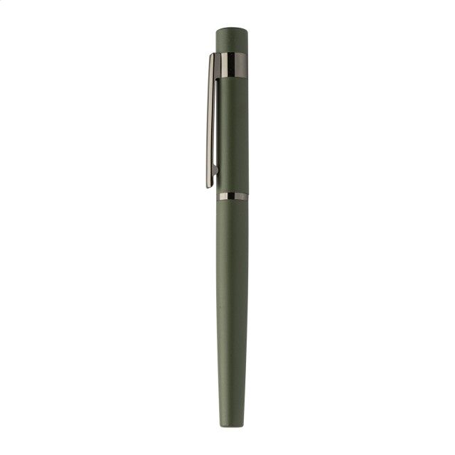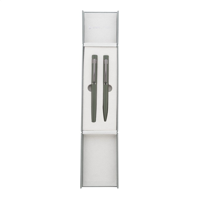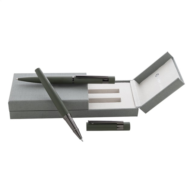 Elegantní sada kovového kuličkového pera a rolleru s lesklými detaily v barvě antracit. V barevně sladěné dárkové krabičce a s modrou náplní. Produkt značky André Philippe.