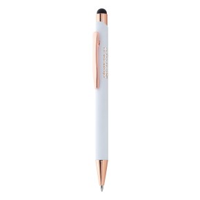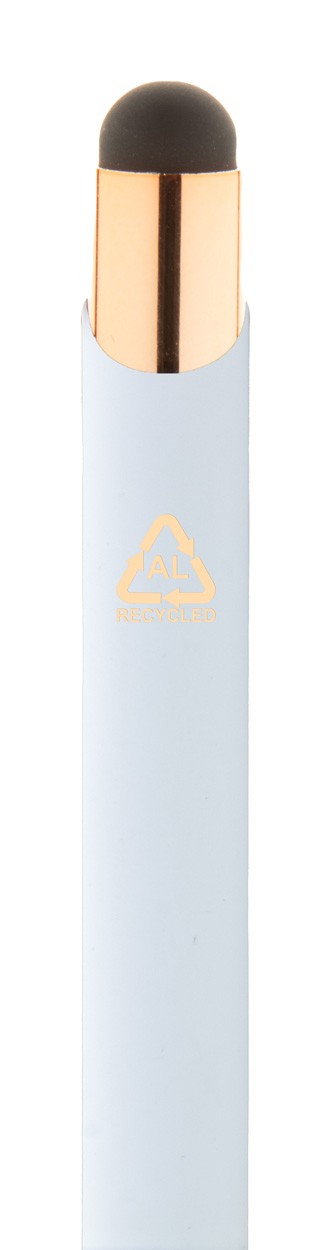 Kuličkové a dotykové pero z recyklovaného hliníku s pogumovaným povrchem a detaily v barvě růžového zlata. Se speciální povrchovou úpravou pro zrcadlové laserové gravírování v barvě růžového zlata. S modrou náplní.