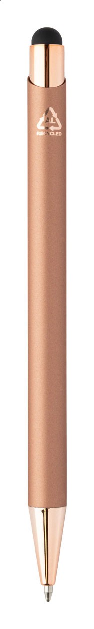 Kuličkové a dotykové pero z recyklovaného hliníku s pogumovaným povrchem a detaily v barvě růžového zlata. Se speciální povrchovou úpravou pro zrcadlové laserové gravírování v barvě růžového zlata. S modrou náplní.