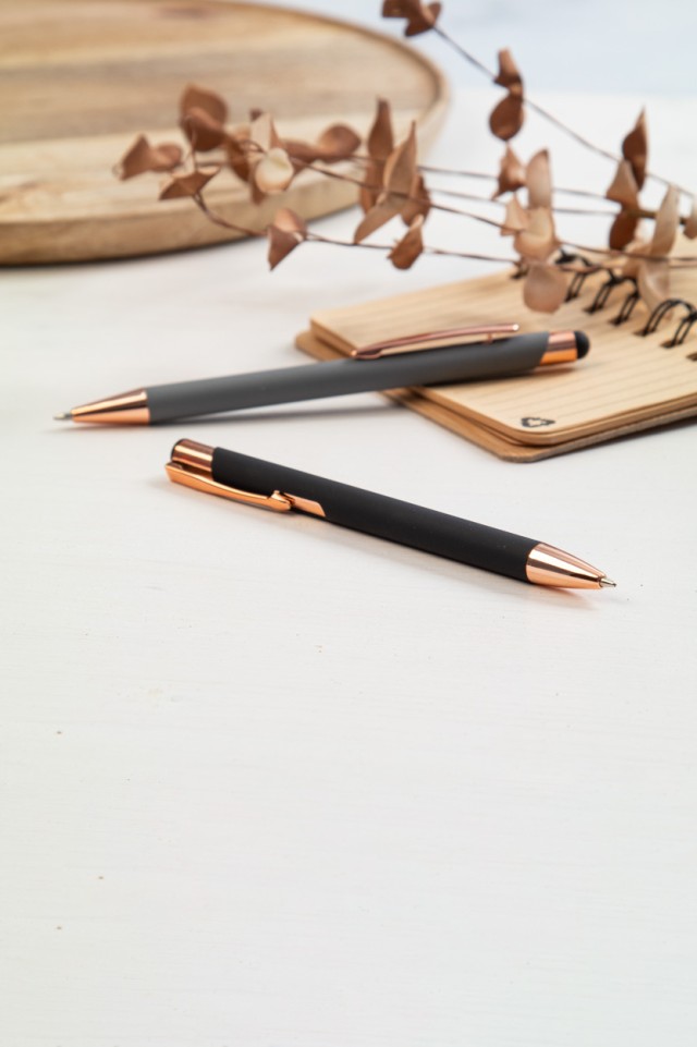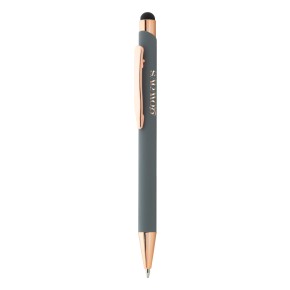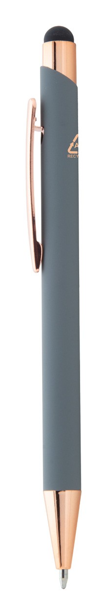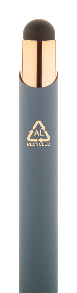Kuličkové a dotykové pero z recyklovaného hliníku s pogumovaným povrchem a detaily v barvě růžového zlata. Se speciální povrchovou úpravou pro zrcadlové laserové gravírování v barvě růžového zlata. S modrou náplní.