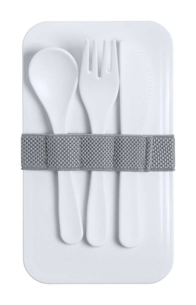 Box na jídlo z antibakteriálního plastu se sadou příborů (vidlička, lžíce a nůž) a elastickým popruhem. Každý má 2 oddíly o objemu 700 ml. V souladu s ISO 22196.
