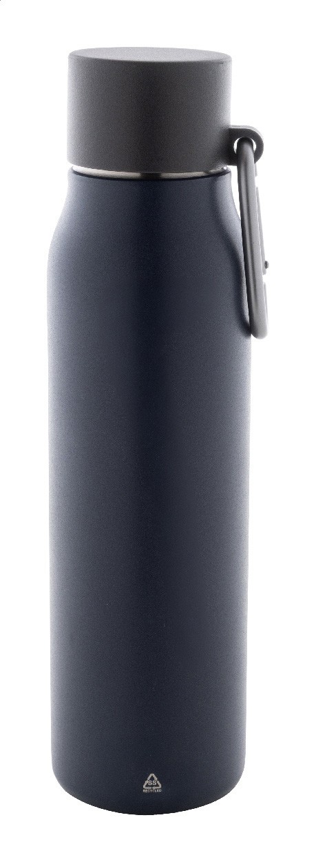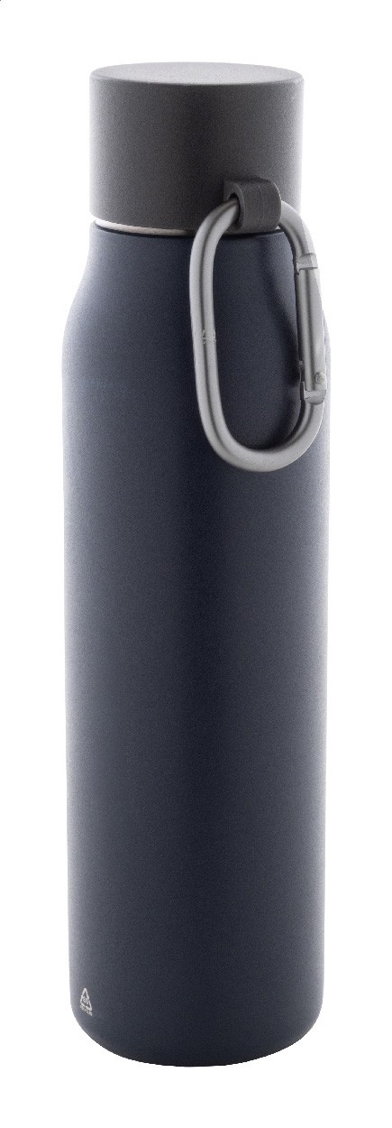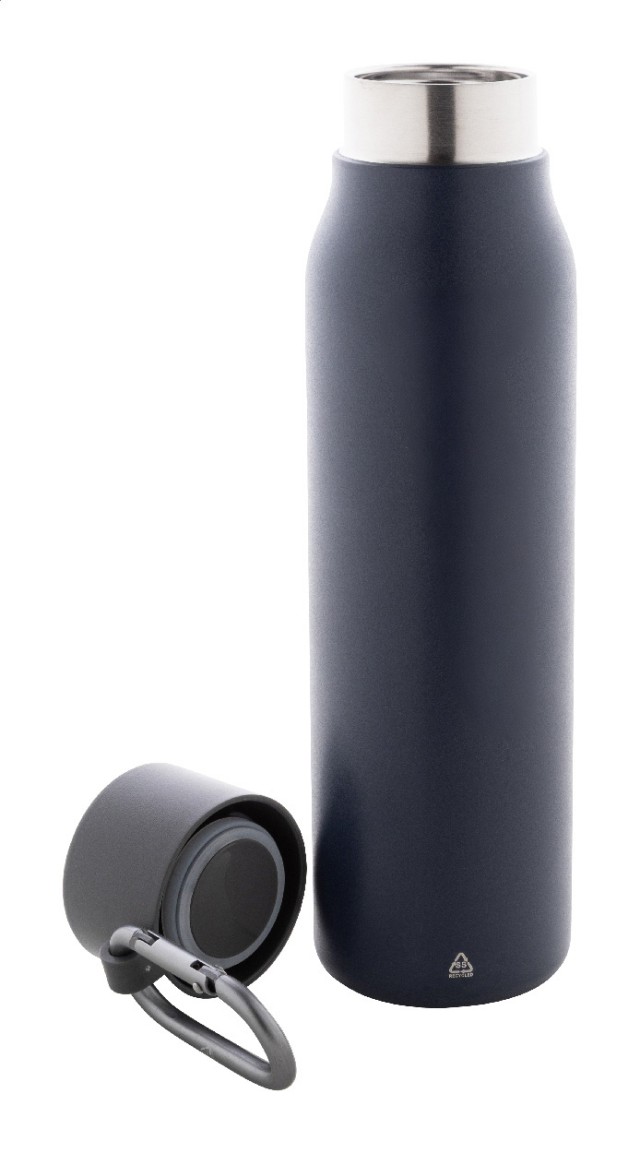 Dvoustěnná vakuová láhev z recyklované nerezové oceli s víčkem z PP a karabinou z recyklovaného hliníku. 500 ml.