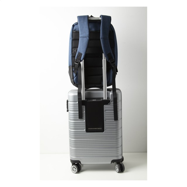 Dvoubarevný batoh s více přihrádkami na zip, uvnitř mnoho kapes, s polstrovanou přihrádkou na notebook (17 "), ergonomickými zády a ramenním popruhem. S kapsou na ochranu proti krádeži, popruh na vozík a vestavěné připojení USB pro power banky. 400D polyester.