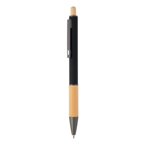 Kuličkové pero z recyklovaného hliníku s bambusovým úchopem a tlačítkem, pogumovaným tělem a kovovými částmi. S modrou náplní.