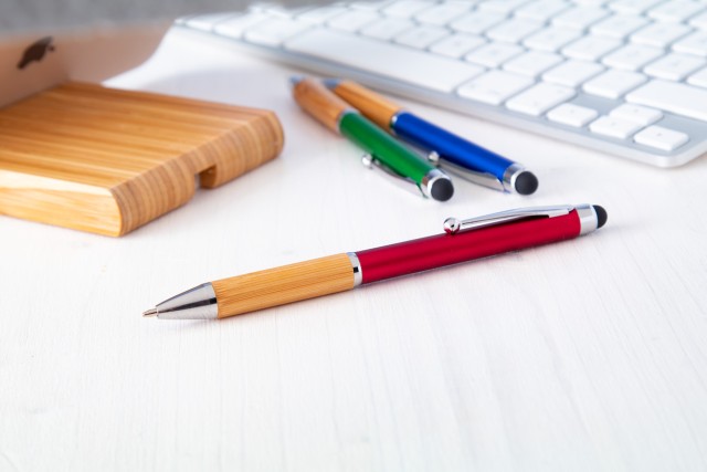 Plastové otočné kuličkové a dotykové pero s bambusovým úchopem, kovovým tělem a lesklými chromovanými částmi. S modrou náplní.