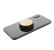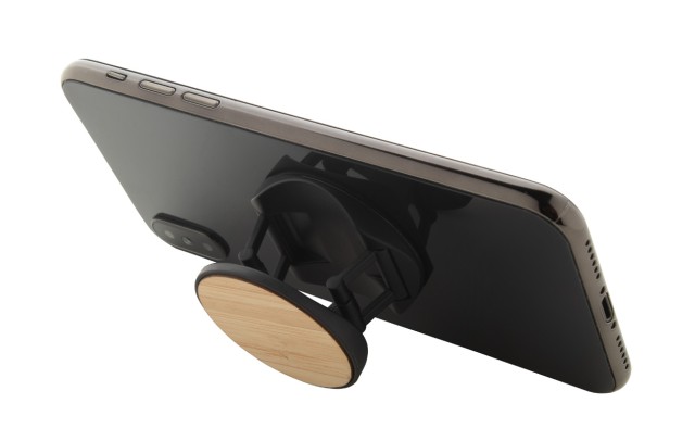 Bambusem potažený, kulatý, plastový stojánek na mobil se samolepicí základnou.
