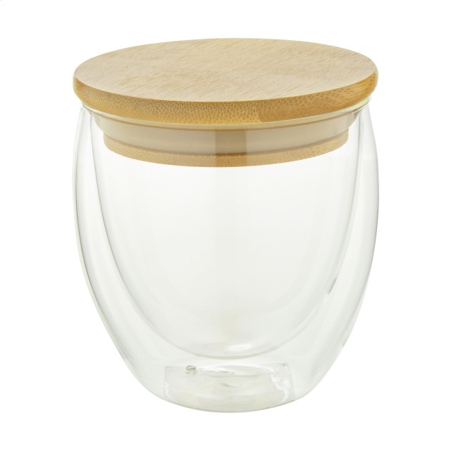 Dvoustěnný termohrnek z borosilikátového skla s bambusovým víčkem, 300 ml. V kraftové papírové krabici.