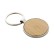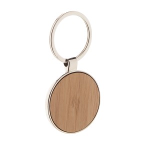 Kovový přívěsek na klíče kulatého tvaru s bambusovou vložkou. V kraftové papírové krabičce.