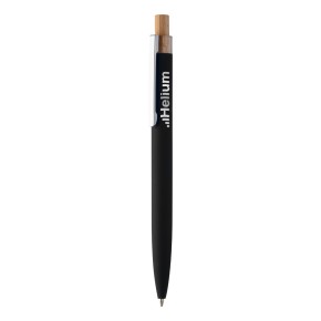 Kuličkové pero z recyklovaného hliníku s pogumovaným povrchem, bambusovým tlačítkem a chromovým klipem. Se speciální vrstvou pro zrcadlové laserové gravírování. S modrou náplní.