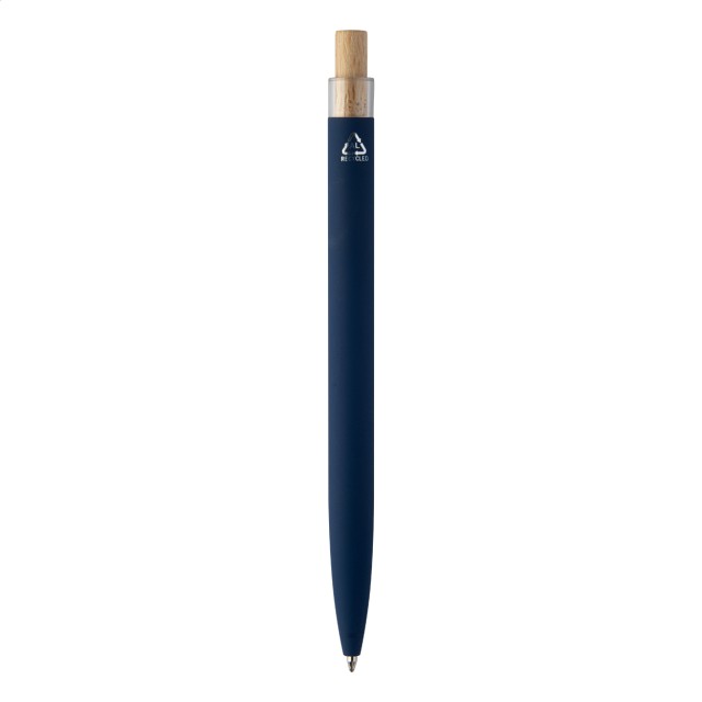 Kuličkové pero z recyklovaného hliníku s pogumovaným povrchem, bambusovým tlačítkem a chromovým klipem. Se speciální vrstvou pro zrcadlové laserové gravírování. S modrou náplní.