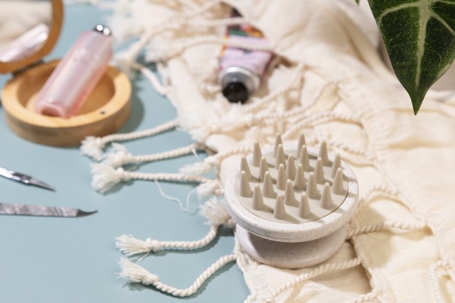 Ekologický masážní přístroj na pokožku hlavy z pšeničné slámy a silikonových štětin. Ideální pro stimulaci krevního oběhu a lepší rozložení šamponu během mytí vlasů.