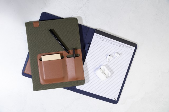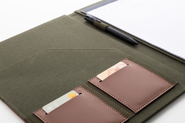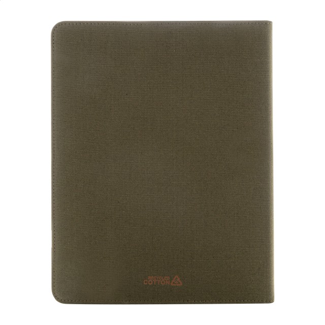 Složka na dokumenty A4 z recyklovaného plátna a recyklované umělé kůže s několika předními a vnitřními kapsami. S blokem na 20 linkovaných listů z recyklovaného papíru. 70 % recyklované bavlny a 30 % RPET polyesteru.