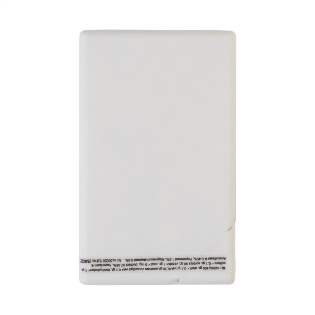 Plastová krabička ve tvaru karty s cca. 8 g mentolových bonbonů.