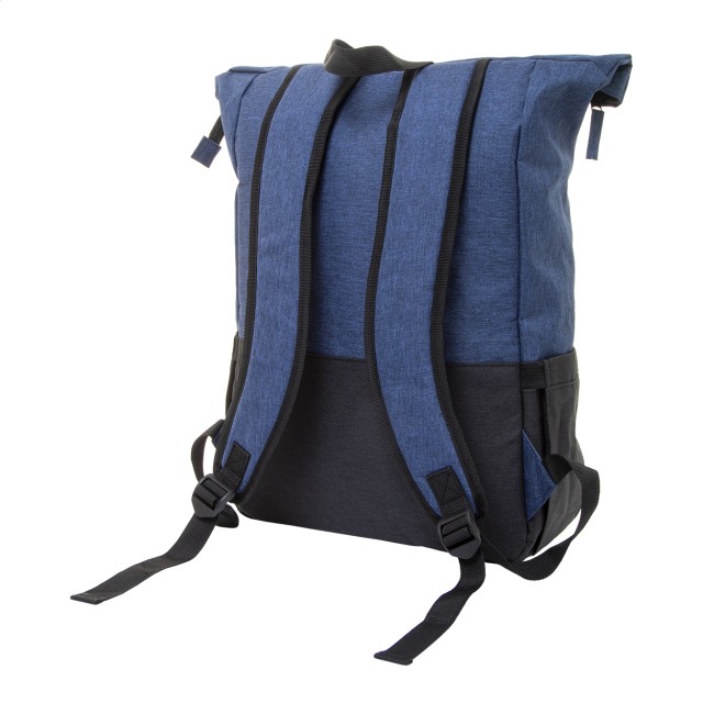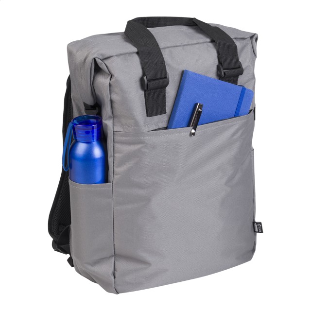 Dvoubarevný rolovací batoh z RPET se zapínáním na přezku, hlavní přihrádka na zip, polstrovaná přihrádka na notebook (15") a tablet (10"), boční kapsy, polstrovaná záda a ramenní popruhy. 300D RPET polyester s výrazným štítkem RPET.