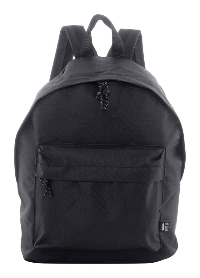 RPET batoh s hlavním prostorem na zip, přední kapsou na zip, polstrovanými zády a ramenními popruhy. Polyester 600D RPET, s výrazným štítkem RPET.