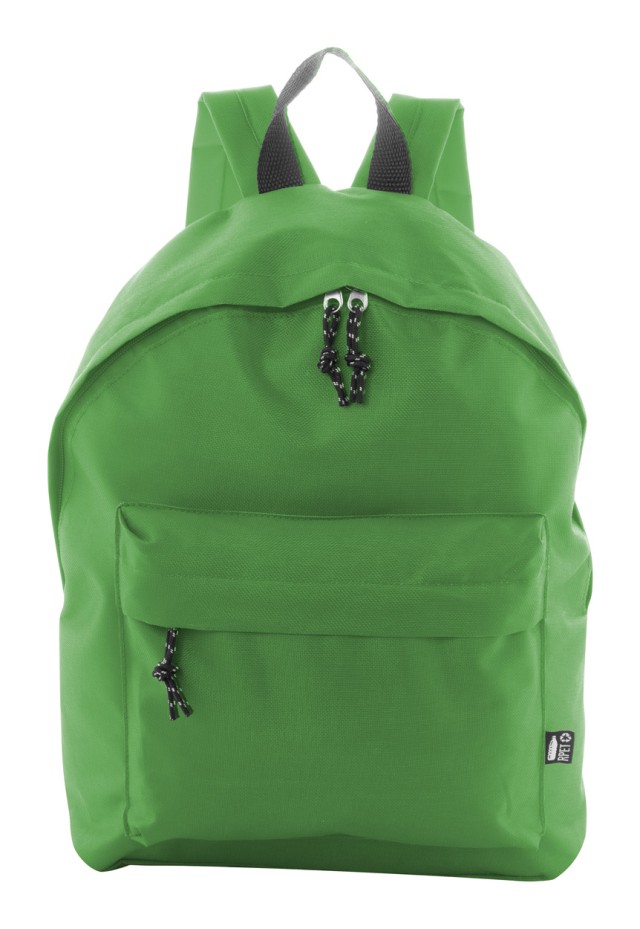 RPET batoh s hlavním prostorem na zip, přední kapsou na zip, polstrovanými zády a ramenními popruhy. Polyester 600D RPET, s výrazným štítkem RPET.
