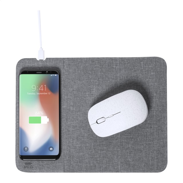 Polyesterová podložka pod myš RPET s vestavěnou bezdrátovou rychlonabíječkou (10W) a funkcí držáku mobilního telefonu. Včetně USB nabíjecího kabelu.