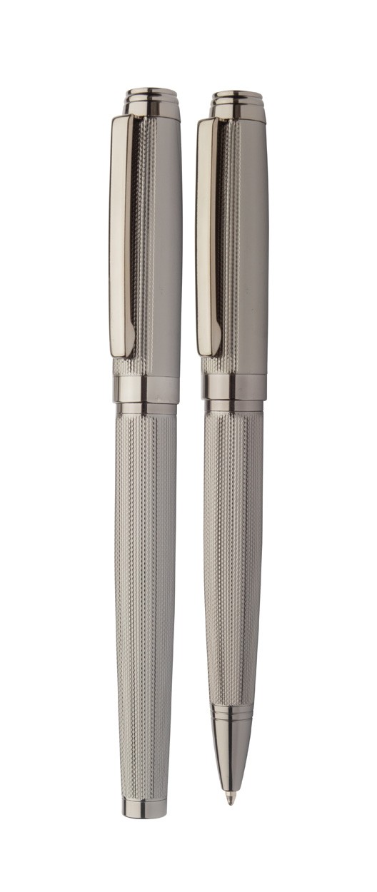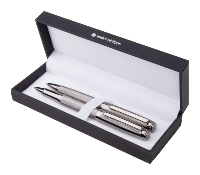 Elegantní sada kovového kuličkového pera a rolleru se vzorovaným tělem. V černé dárkové krabičce, s modrou náplní. Produkt značky André Philippe.