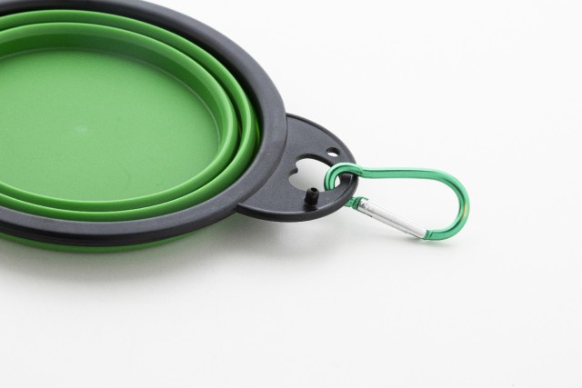 Skládací miska pro domácí mazlíčky z odolného TPE se dvěma přihrádkami o objemu 450 ml a barevně sladěnou hliníkovou karabinou.