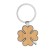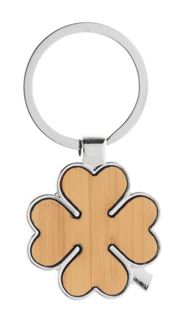Kovový přívěšek na klíče ve tvaru čtyřlístku s bambusovou vložkou. V kraftové papírové krabičce.