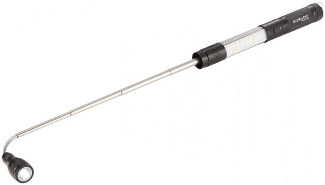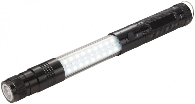 Svítilna s teleskopickým sběrným nástrojem a bočním světlem COB. S magnetem a kovovým kroužkem pro hands free osvětlení. Boční světlo COB se 3 světelnými režimy: bílá, červená a červený blikající režim. Sběrný nástroj o délce až 40 cm disponuje magnetickou hlavou pro nacházení malých kovových předmětů v místech, která jsou těžko dostupná. Baterie součástí balení a vložena. Zabaleno v dárkové krabičce STAC.