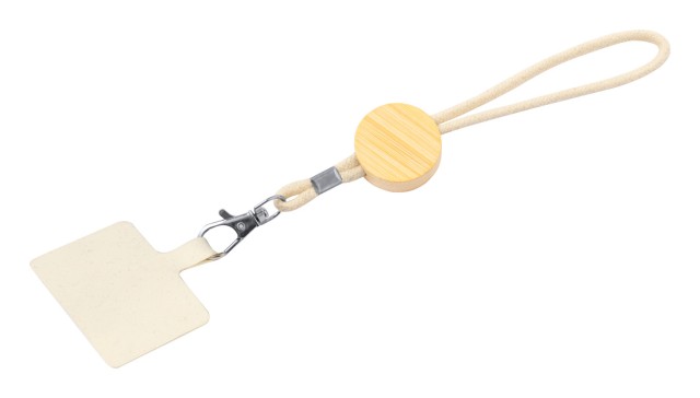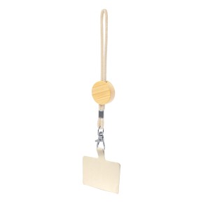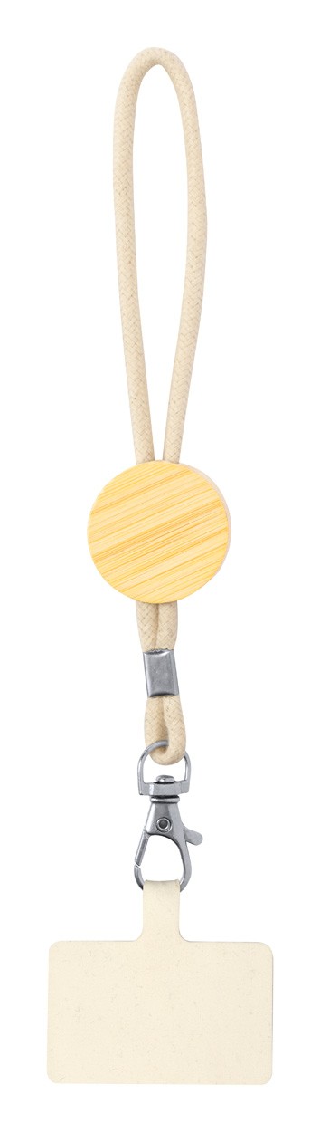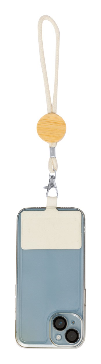 Bavlněné poutko na mobil s kulatým bambusovým štítkem, vložkou na telefon a kovovou karabinou.