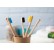 Kartáček na zuby pro dospělé z bambusu a barevnými nylonovými štětinami a barevným koncem držadla. V kraftové papírové krabičce.