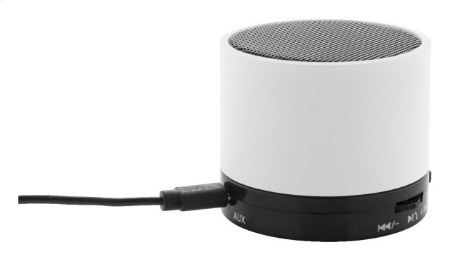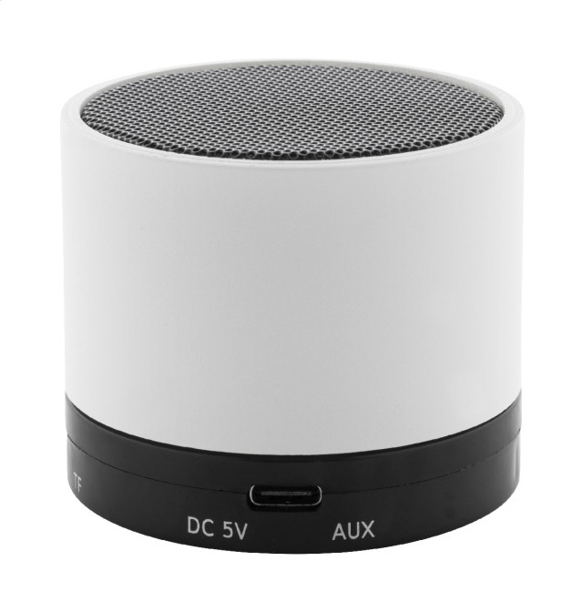 Bezdrátový reproduktor z recyklovaného ABS v pogumovaném pouzdře s kovovou síťovinou a dobíjecí baterií (300 mAh). S funkcí handsfree hovorů a přehrávání MP3 z micro SD karty. Včetně nabíjecího kabelu USB.