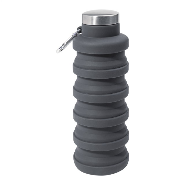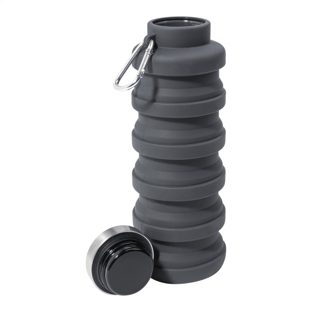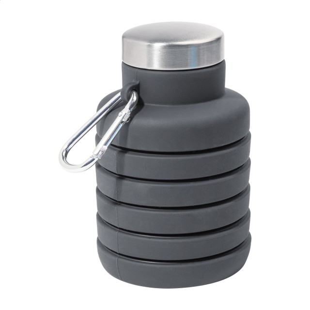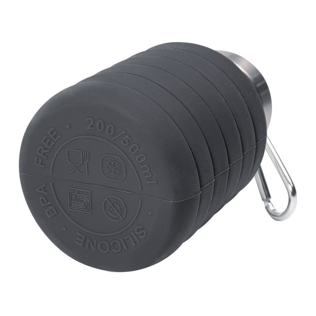 Skládací silikonová láhev s víčkem z nerezové oceli a hliníkovou karabinou. 500 ml