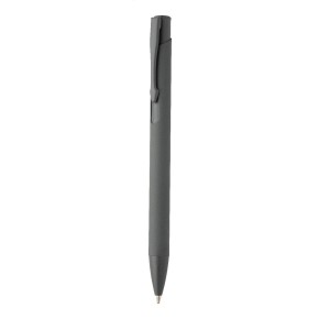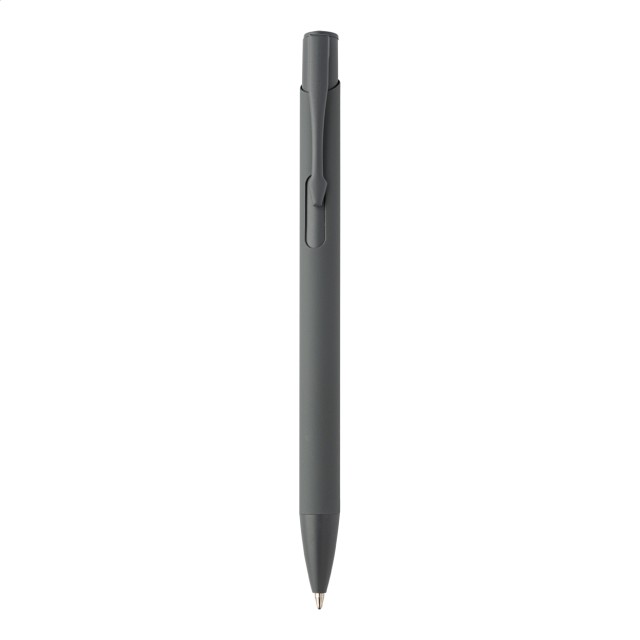 Kuličkové pero z recyklovaného hliníku s pogumovaným tělem a barevnými lesklými kovovými díly. Se speciálním povrchem pro zrcadlové gravírování, které odpovídá kovovým částem. S modrou náplní.