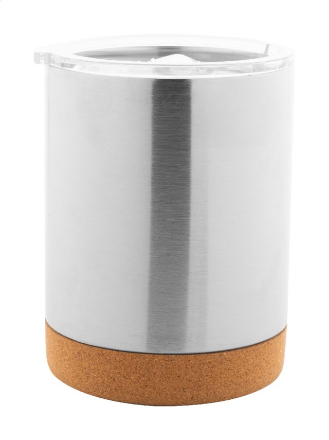Dvoustěnný nerezový termohrnek s víčkem na pití a dnem z přírodního korku, 330 ml. V kraftové papírové krabici.