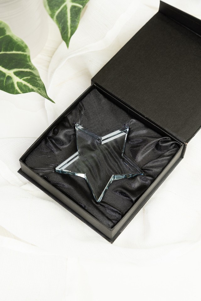 Skleněná trofej ve tvaru hvězdy v černé dárkové krabičce.