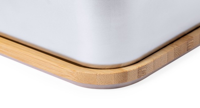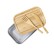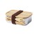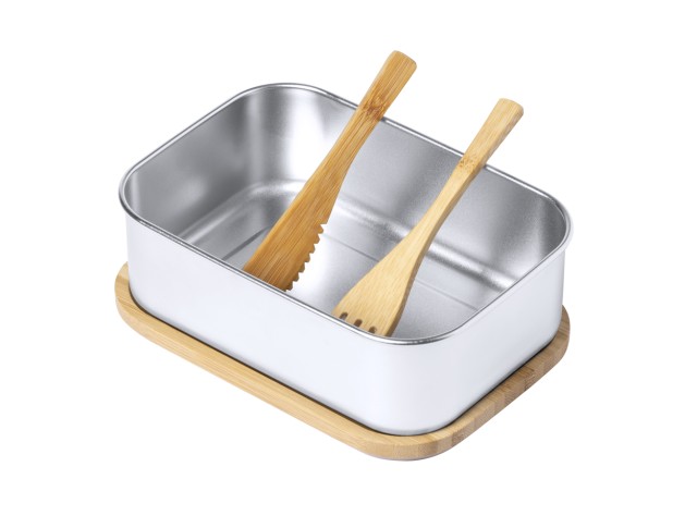 Box na jídlo z nerezové oceli s přírodním bambusovým víkem. Se sadou bambusových příborů (nůž a vidlička) a elastickým popruhem, 600 ml.