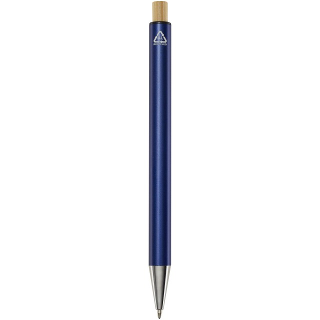 Kuličkové pero Cyrus je vyrobeno z recyklovaného hliníku, což vyžaduje méně energie než výroba hliníku z nerostných surovin. Snižuje také množství odpadu na skládkách a pomáhá šetřit přírodní zdroje s cílem snížit emise skleníkových plynů. Tlačítko je vyrobeno z bambusu. Barva inkoustu: Modrá. Délka psaní: 800 metrů. Rozměr hrotu: 1,00 mm.