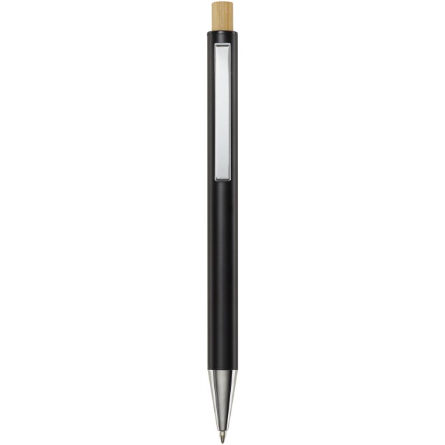 Kuličkové pero Cyrus je vyrobeno z recyklovaného hliníku, což vyžaduje méně energie než výroba hliníku z nerostných surovin. Snižuje také množství odpadu na skládkách a pomáhá šetřit přírodní zdroje s cílem snížit emise skleníkových plynů. Tlačítko je vyrobeno z bambusu. Barva inkoustu: Modrá. Délka psaní: 800 metrů. Rozměr hrotu: 1,00 mm.