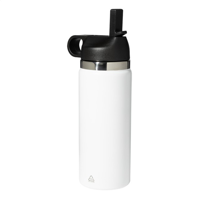 Dvoustěnná vakuová láhev z recyklované nerezové oceli s odklápěcím víčkem z PP, rukojetí a integrovaným brčkem. 500 ml.