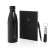 Tato luxusní dárková sada obsahuje vše potřebné pro pohodlný a stylový pracovní den. 480ml dvoustěnná láhev z recyklované nerezové oceli s vakuovou izolací udrží nápoje teplé nebo studené po dlouhou dobu. Nepropustné víčko zajišťuje bezpečné přenášení bez rizika rozlití. Pro snadný přístup k vašim klíčům je součástí prémiový přívěsek Swiss Peak s lesklým kovovým povrchem a elegantním páskem z PU kůže. Sada dále obsahuje stylové business kuličkové pero s výdrží psaní až 1000 metrů a zápisník s měkkým dotykem z recyklovaného polyesteru PU, s 160 krémovými stránkami z recyklovaného papíru – ideální pro poznámky a nápady. Všechny produkty jsou certifikovány RCS, což zaručuje plně ověřený dodavatelský řetězec použitých recyklovaných materiálů.