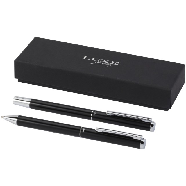 Tubusy per v této sadě kuličkového pera a pera typu roller jsou vyrobeny z matně barevného eloxovaného recyklovaného hliníku s lesklými chromovanými doplňky. Hliník je vysoce recyklovatelný materiál a výběrem této sady per můžete podpořit udržitelnější postupy výroby a dát nový život vyřazeným hliníkovým materiálům. Tato pera slouží jako praktická a udržitelnější možnost pro jednotlivce a organizace, kteří hledají psací potřeby šetrné k životnímu prostředí. Barva inkoustu pera: Černá. Rozměr hrotu: 1,0 mm. Délka psaní: 800 metrů. Dodáváno v černé dárkové krabičce s černou hedvábnou stuhou. Velikost krabičky: 16,2 × 5,1 × 2,7 cm.
