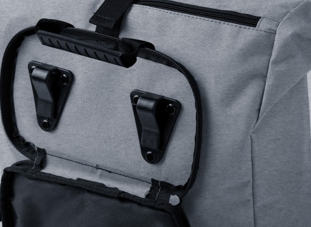 Batoh na kolo z polyesteru 600D RPET s přední kapsou na zip a odnímatelnými polstrovanými ramenními popruhy. Se skrytými svorkami pro montáž na rám.