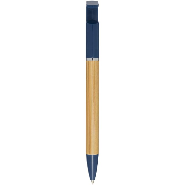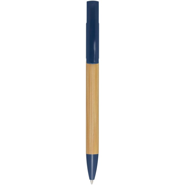 Bambusové kuličkové pero, které funguje také jako držák na telefon. Tlačítko a středový kroužek jsou vyrobeny z recyklovaného plastu, hrot z mosazi a tělo z bambusu z odpovědných zdrojů. Barva inkoustu: Modrá. Délka psaní: 1000 metrů. Rozměr hrotu: 1,0 mm.