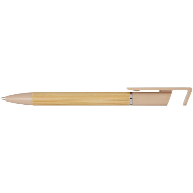 Bambusové kuličkové pero, které funguje také jako držák na telefon. Tlačítko a středový kroužek jsou vyrobeny z recyklovaného plastu, hrot z mosazi a tělo z bambusu z odpovědných zdrojů. Barva inkoustu: Černá. Délka psaní: 1000 metrů. Rozměr hrotu: 1,0 mm.