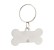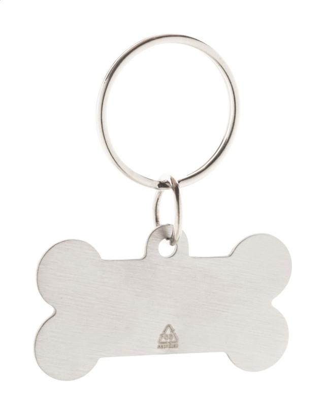 Psí známka z recyklované nerezové oceli ve tvaru kosti s kroužkem na klíče.