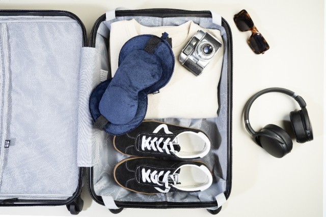 Cestovní polštář z RPET polyesteru s integrovanou oční maskou a elastickými popruhy. Zapíná se do kompaktního kulovitého tvaru pro snadné skladování a obsahuje karabinu z PP pro připevnění k zavazadlu. S výraznou etiketou z RPET.