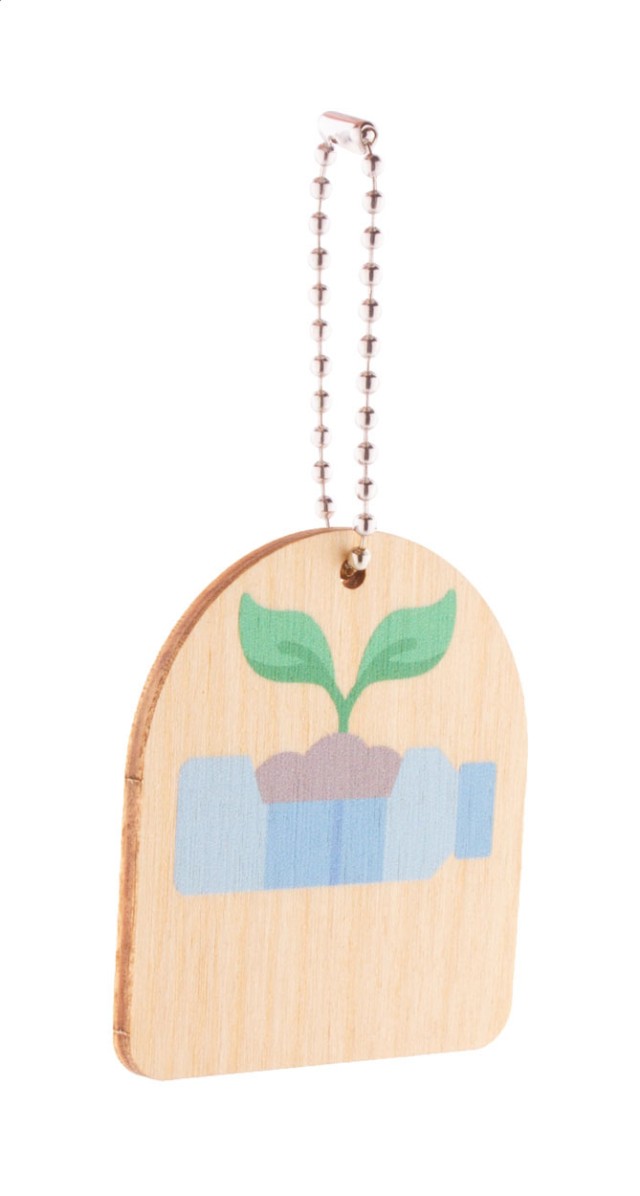 Přívěsek na klíče z březové překližky s kovovým řetízkem a motivem ochrany životního prostředí.