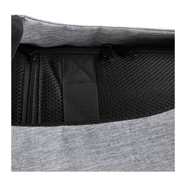 Voděodolný batoh s ochranou proti krádeži s několika přihrádkami na zip, polstrovaným prostorem pro laptop (15 ") a tabletem (12"), polstrovanými zády a ramenním popruhem. S vestavěným USB připojením pro power banky. 300D Polyester.
