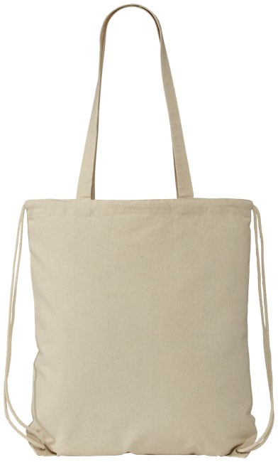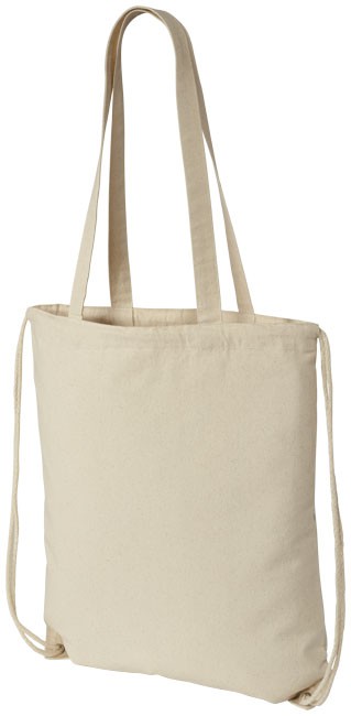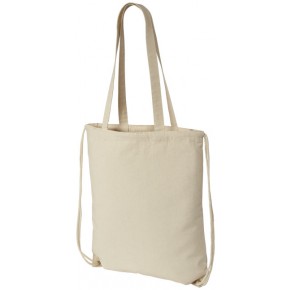 Multifunkční bavlněný vak s dlouhými úchyty a stahovací šňůrkou, který lze nosit jako tašku nebo batoh. Velký hlavní oddíl s uzavíráním na šňůrku. Batoh má dva popruhy o délce 31 cm. Objem: 1,5 l, nosnost do 5 kg.